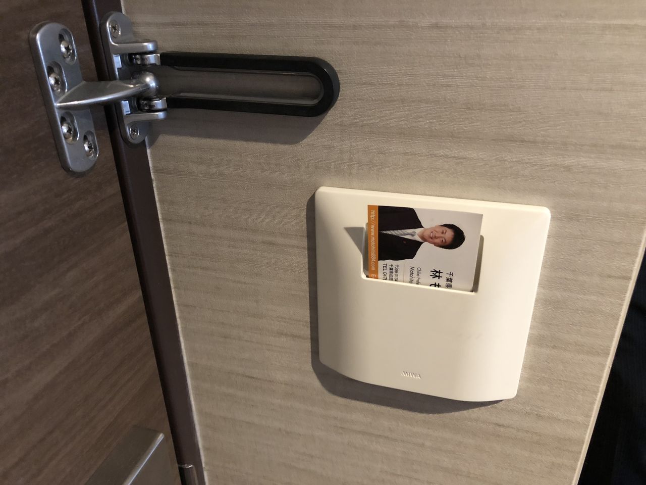 そんな時は写真のように名刺(カード型ならなんでもOKです)を差し込んでおくと、外出時も部屋の電源が落ちないので安心です。