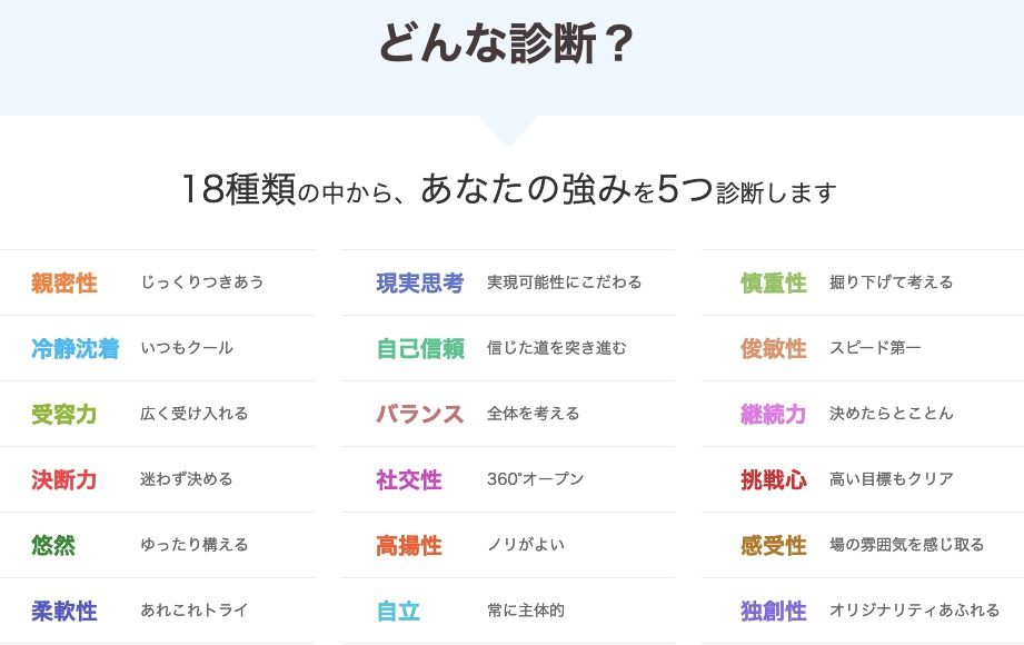 画面に表示される質問に答えていくと、ご覧の18種類の中からあなたの強みを5つ見つけ出してくれます。