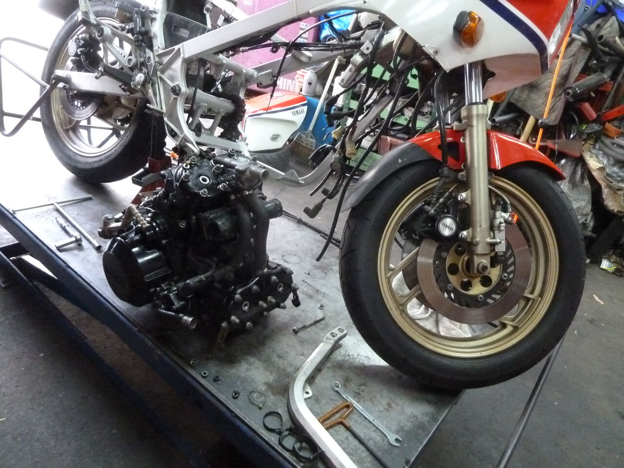 Fサスが出来ましたのでオーバーホールエンジンを車体に載せます