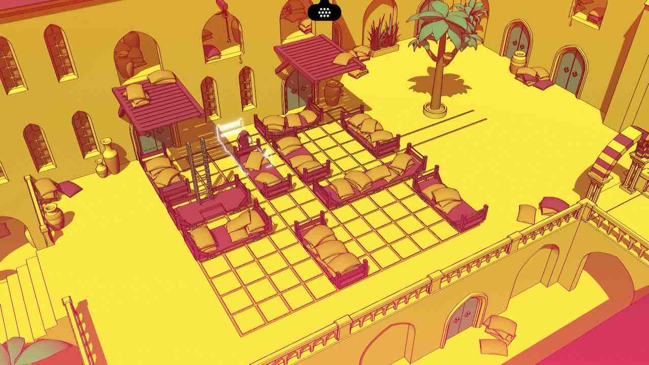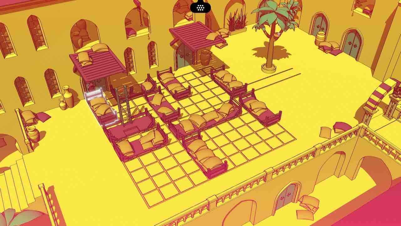 右中央の台車をずらし、左上の横台車を右に寄せます。寄せ終えたら、中央上のふたつ並んだ縦台車のうち、左のやつを上へ引き、ハシゴ台車とその下の台車をひとつずつ右に寄せます。