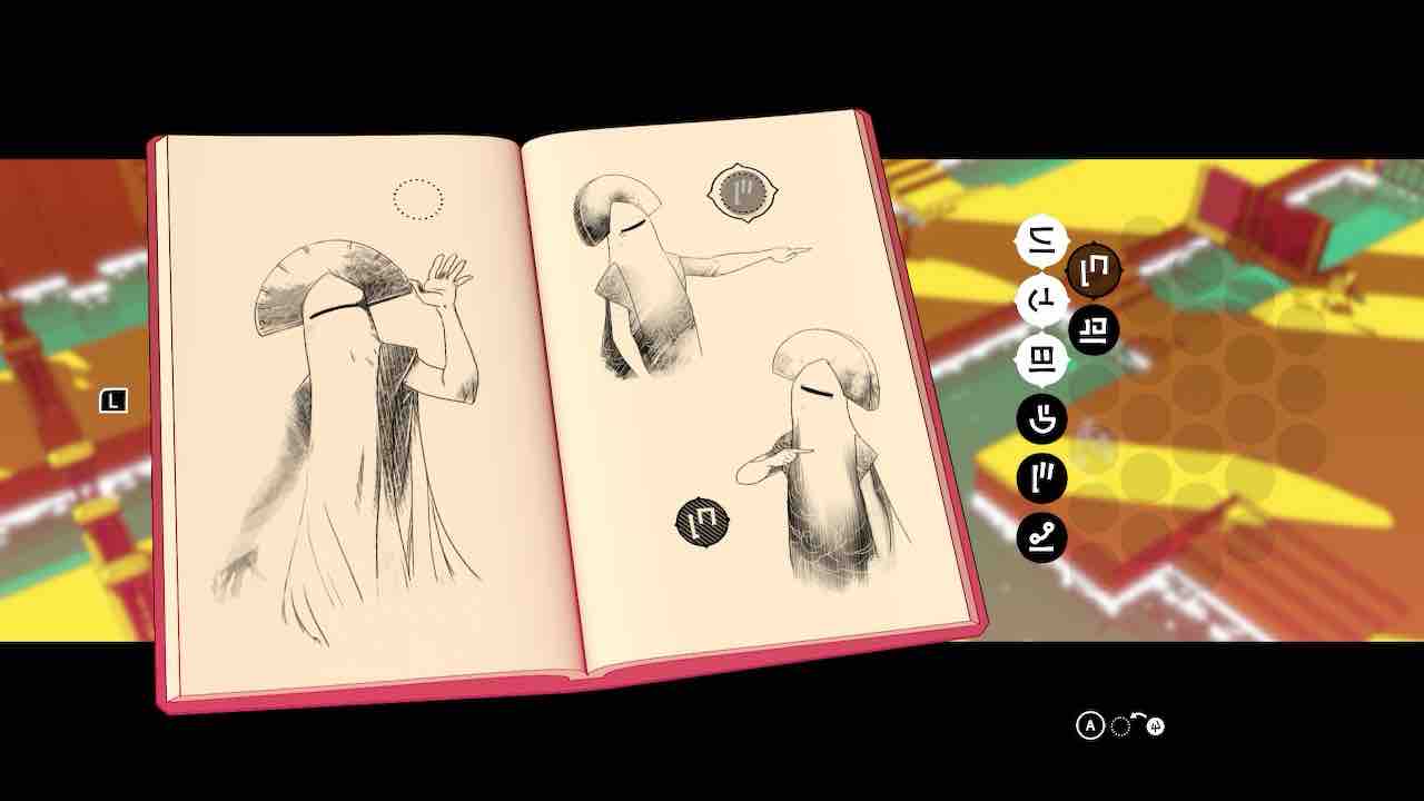 先ほど手に入れたレンズをはめると「このマークの文字を揃えよ」というヒントが出るので揃え、解析が終わったらレンズを回収します。これを4箇所やると4つの文が獲得できるはずです。主人公がノートをとってくれるので、スクショを撮らなくても大丈夫。