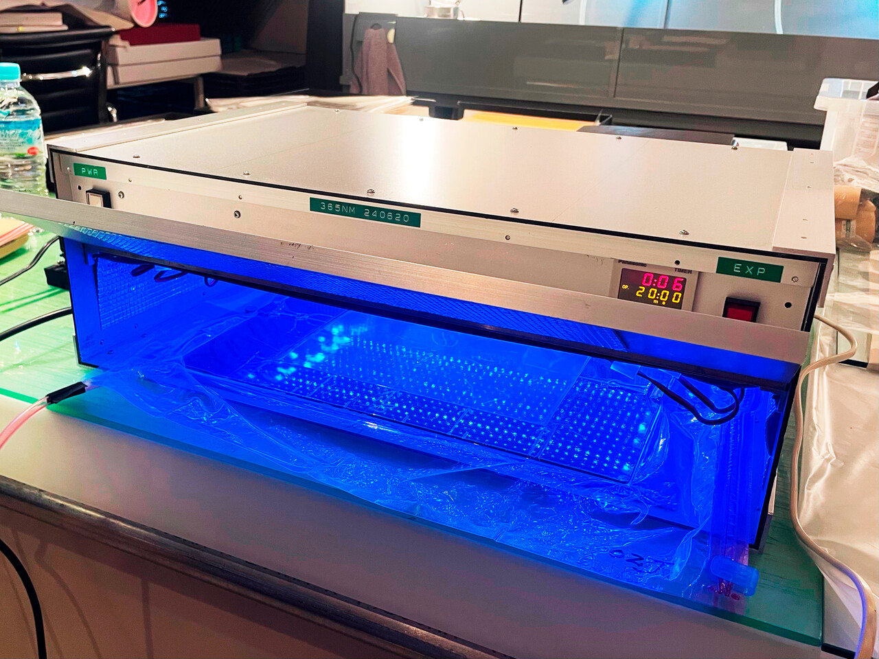 左は自家製LED紫外線露光機、右はプリント用バキューム装置。