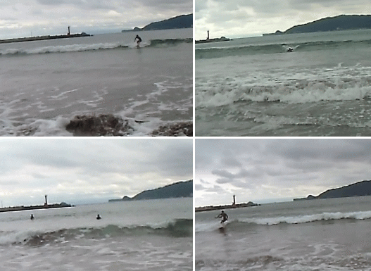 波待ち(上の4画像の左下)ではよく沈みますが、うねりへの反応は上々(4画像の右上)でした。