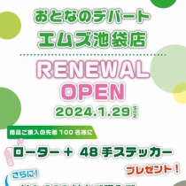 いつも大人のデパートエムズをご愛顧いただき、ありがとうございます。 2024年1月29日大人のデパートエムズ池袋店がリニューアルオープン致しました。 改装中ご不便、ご迷惑をお掛けいたしましたことをお詫び申し上げます。 リニューアルオープンに伴い、イベントを開催 ...