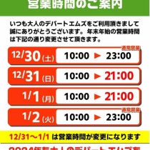 いつも大人のデパートエムズをご利用頂き誠にありがとうございます。 2023年も残すところあと僅かになりました! 年末年始の営業時間のについてお知らせです 今年も大人のデパートエムズ全店休まず営業します!! 【エムズ秋葉原店・池袋店・立川店】 12/30(土)10:00〜23: ...