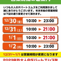 いつも大人のデパートエムズをご利用頂き誠にありがとうございます。 2022年も残すところあと僅かになりました!! 年末年始の営業時間のお知らせをさせていただきます 今年も休まず営業します! 【エムズ秋葉原店・池袋店・立川店】 12/30(金)10:00〜23:00 ◎通常営業 1 ...