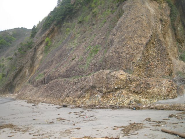 浦浜地区のトンネル脇から浜辺へ出ると、山肌を削ってつけたと思しき道がある。低く見えるが、これで波打ち際からは2mほどの高さにある。