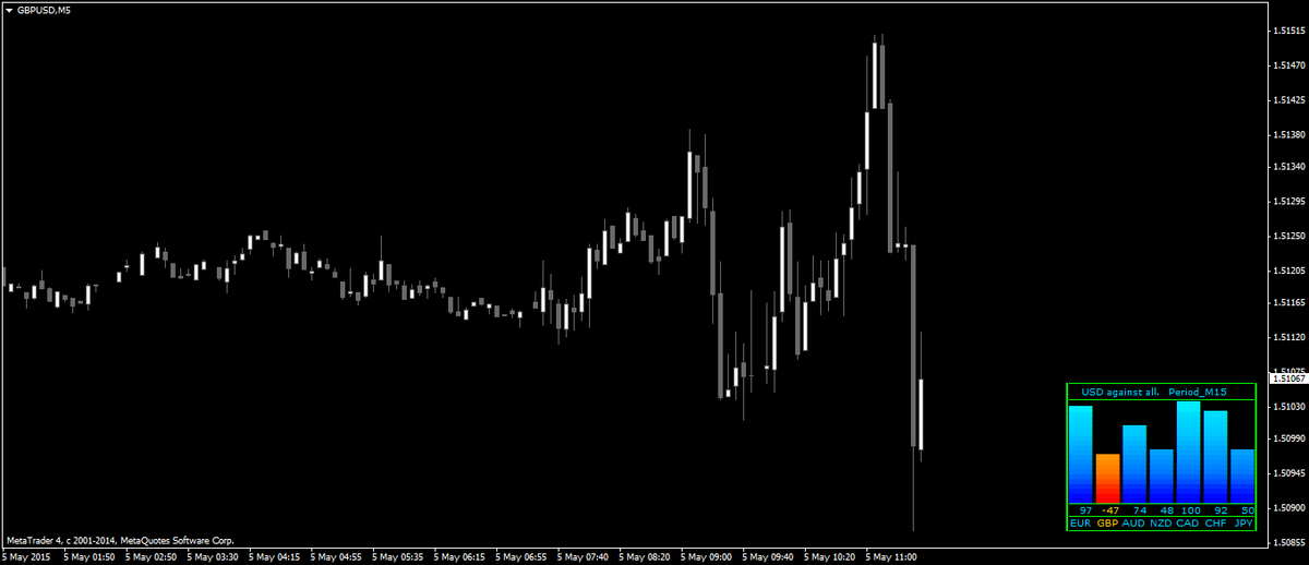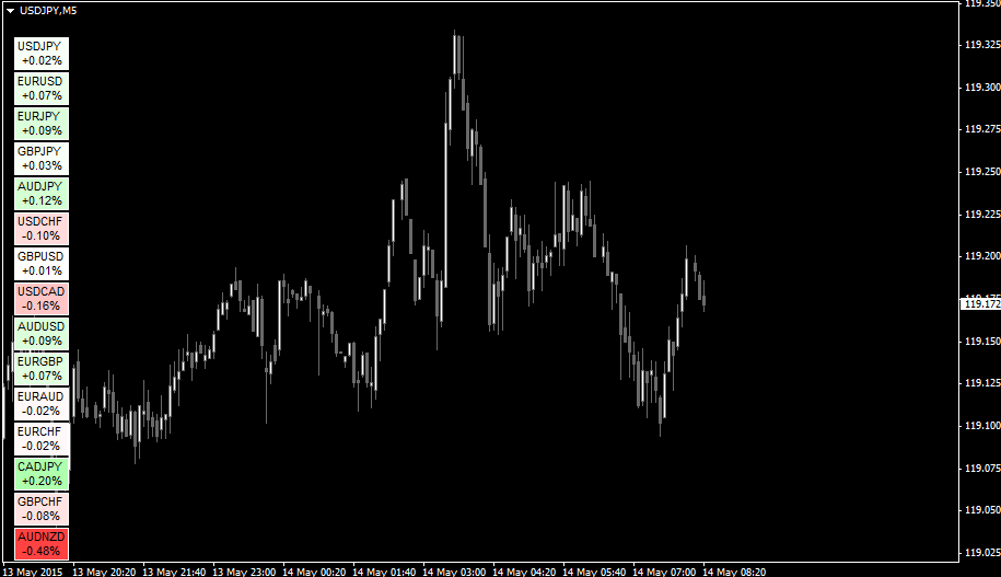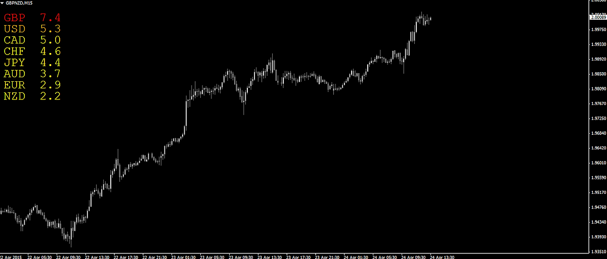 通貨の強度を強いものから順に表示するMT4インジケーター。画像の右下に表示されているのが今回紹介するインジ「CM_Strength」です。