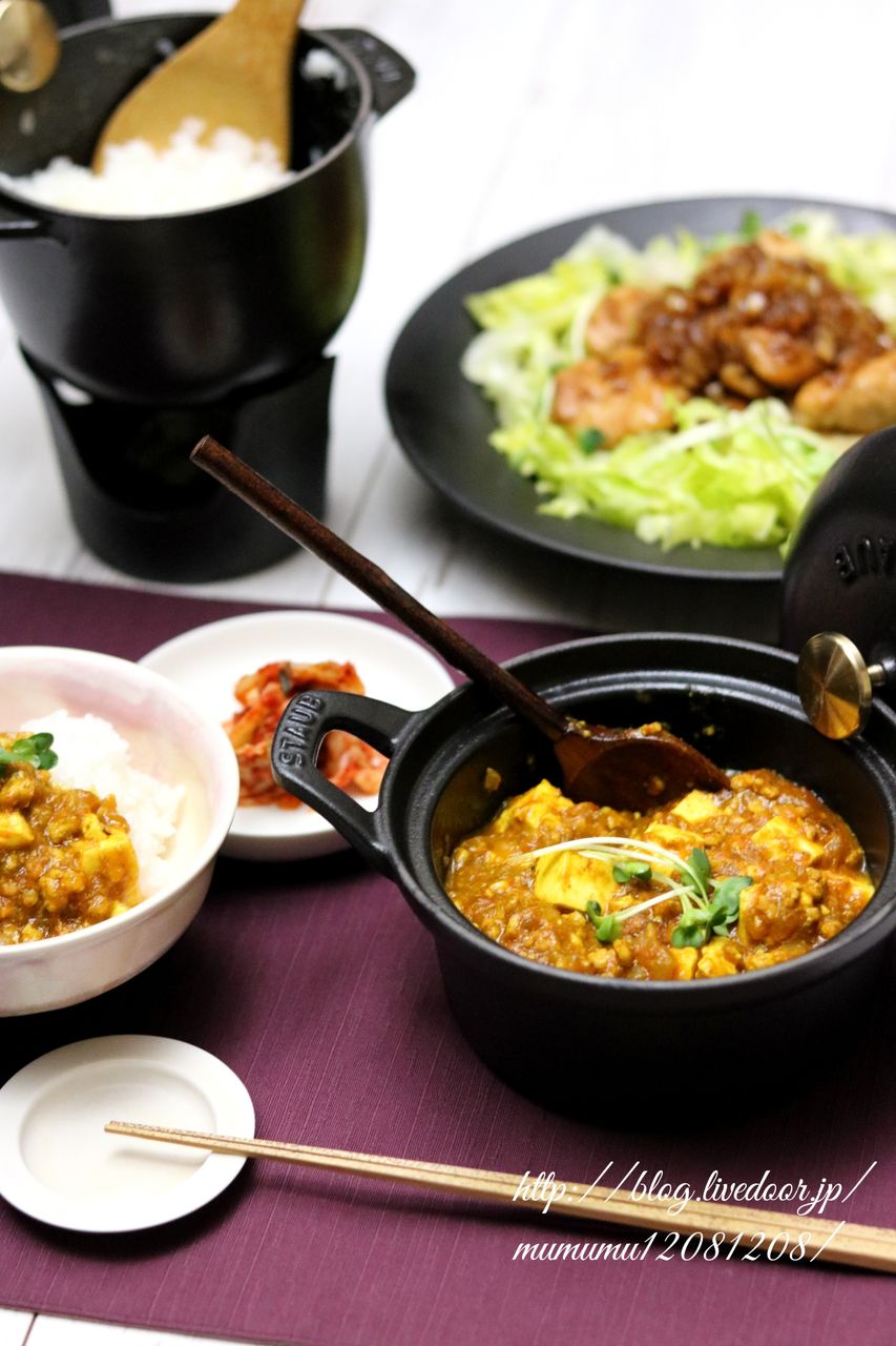 ストウブの取っ手にも負けない、黄金色に仕上がったカレー麻婆。