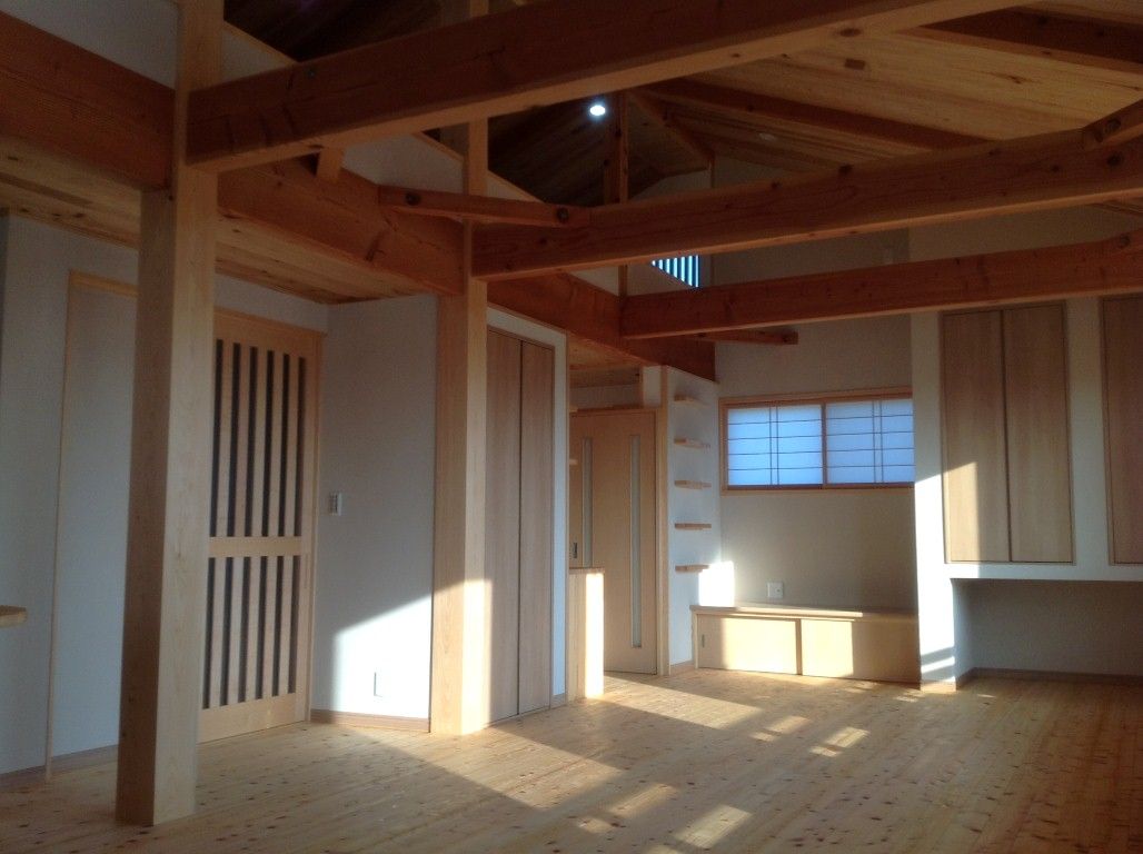 洗濯部屋、出入りしやすい家族用勝手口があり綺麗に保てるお客様用玄関。そして何より、無垢材の梁、傾斜天井、床、