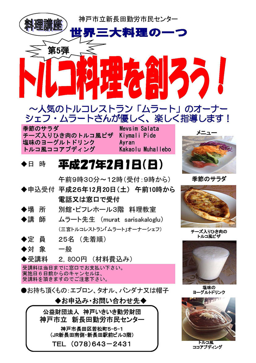 December 13, 2014 トルコ料理ムラート【トルコ料理教室】 皆さん、こんにちわ。 ムラートです! いつも参加してくれてありがとうございます! さむい毎日ですので、風邪ひかないようにしてくださいね。 来年、2月1日に料理教室しま〜す。 12月20日(土)午前10時から電話または、窓口にて受け付けします。 受付け電話番号は【078-643-2431】 楽しみにしててくださいね! それでは、すてきなねんまつと新年おむかえください。 「{Category1}」カテゴリの最新記事 < 前の記事次の記事 > コメント コメントフォーム 名前 コメント 評価する リセット リセット 顔 星 投稿する 情報を記憶 トラックバック