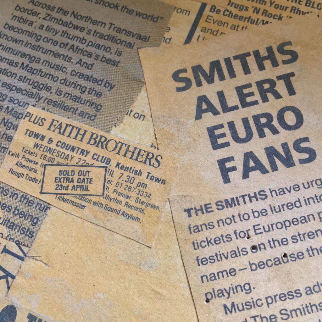 箱のど真ん中には「SMITHS ALERT EURO FANS」の文字。東京アラートならぬスミスアラートがこの時期ヨーロッパのファンに発令という記事があり、その横にひっそりFaith BrothersのライブがSOLD OUTとあるのが何とも微笑ましい。