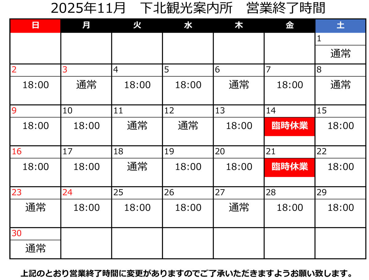 下北観光案内所 11月の臨時休業と営業時間変更のお知らせ