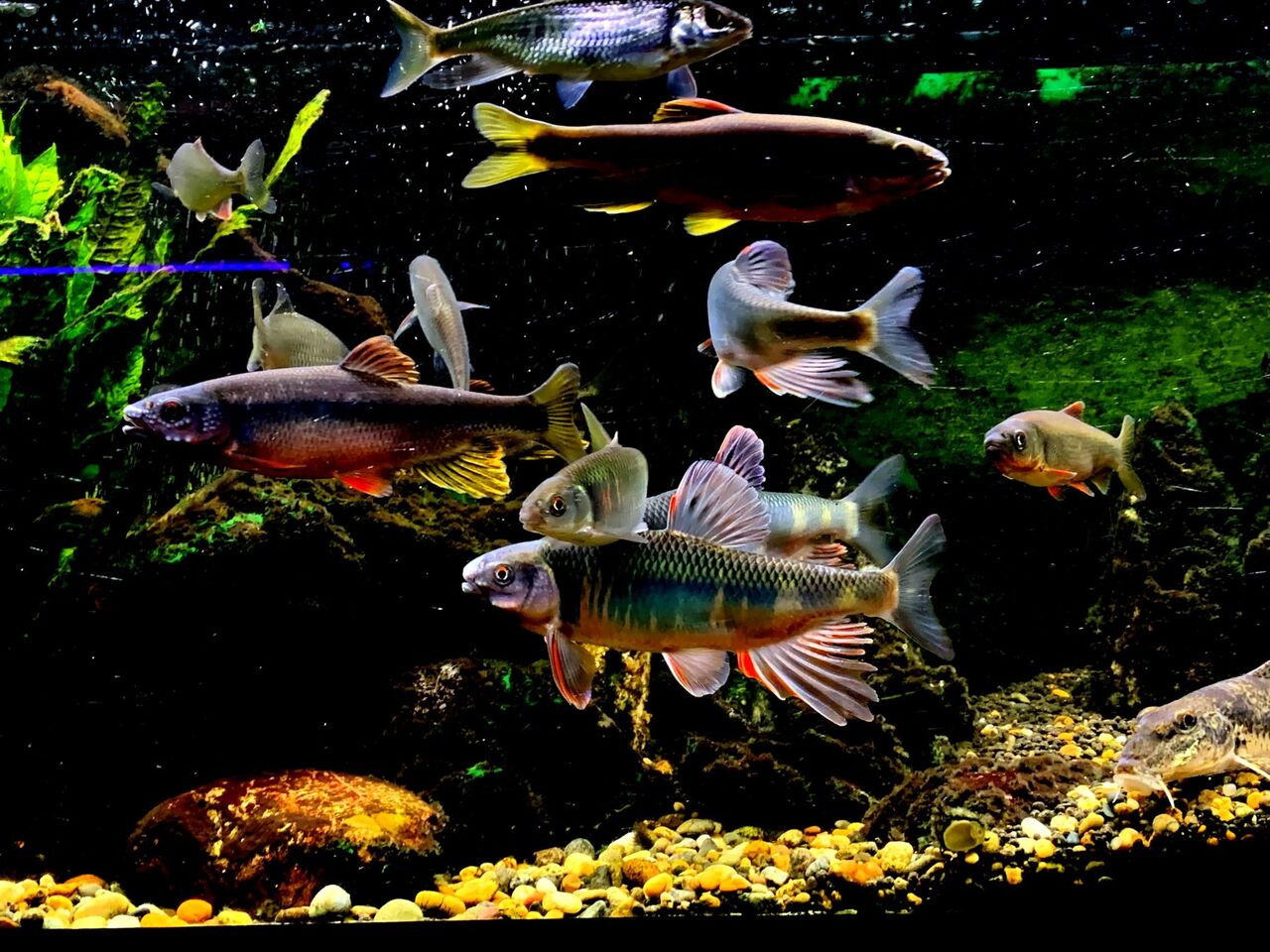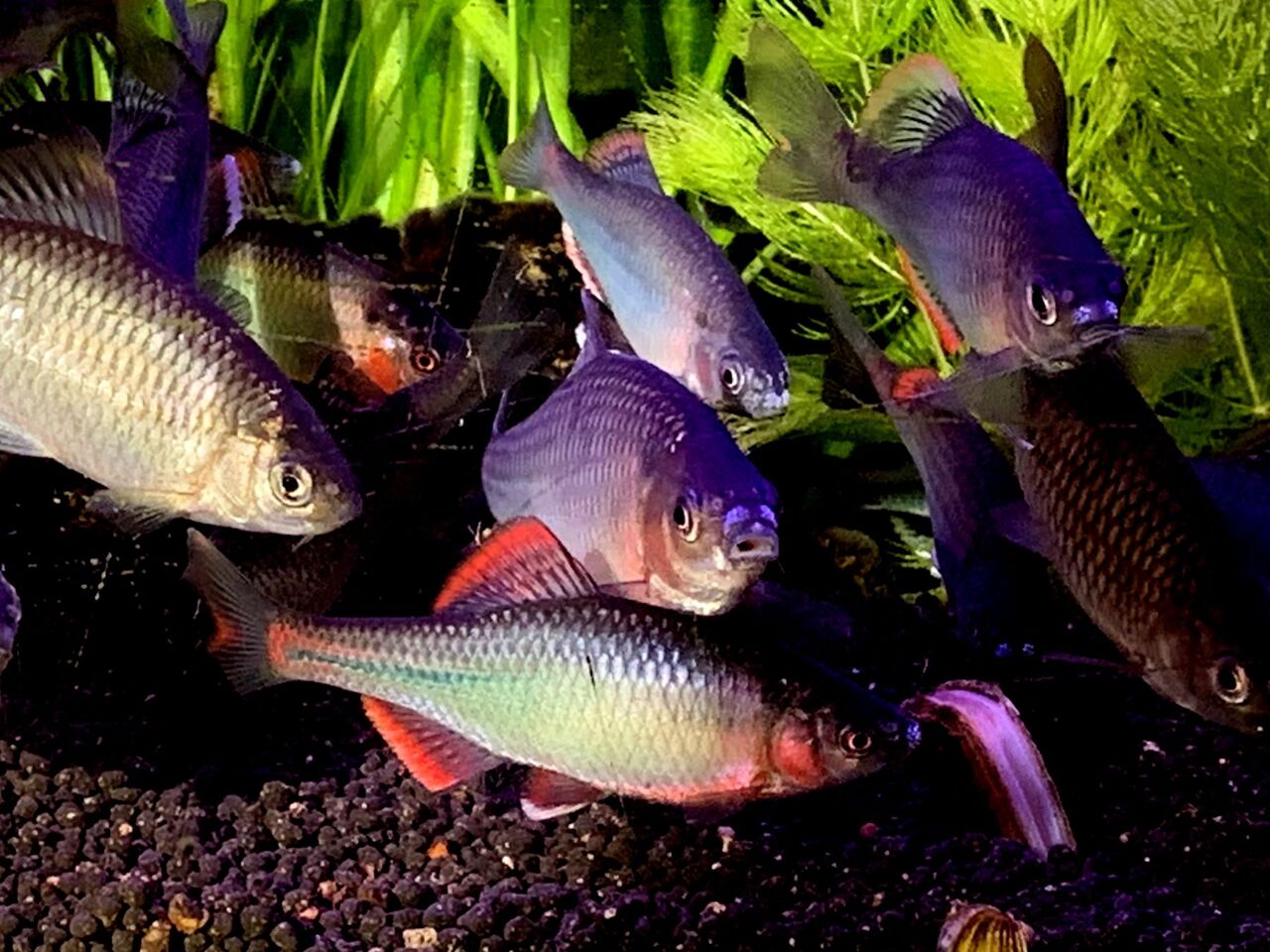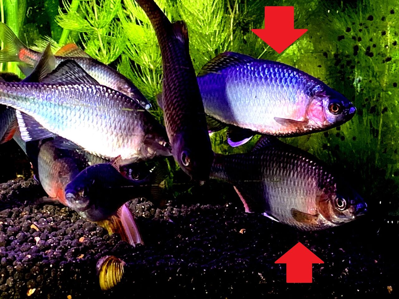 夜に撮影したのでLED照明下であるのが残念であるが、タナゴ達の様子も。