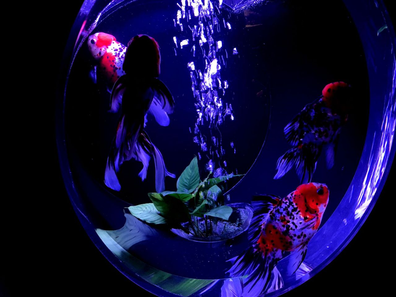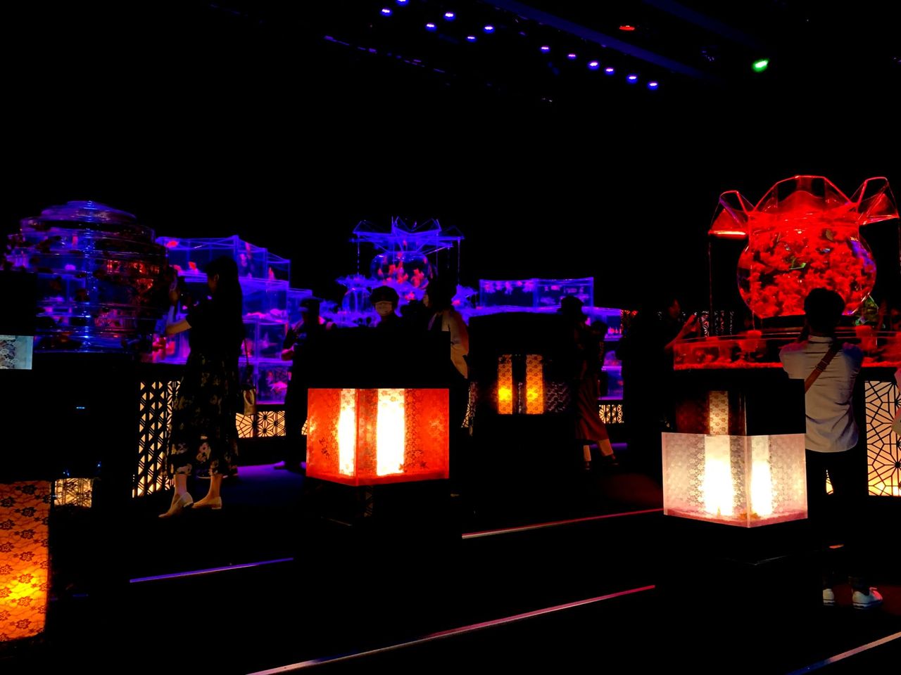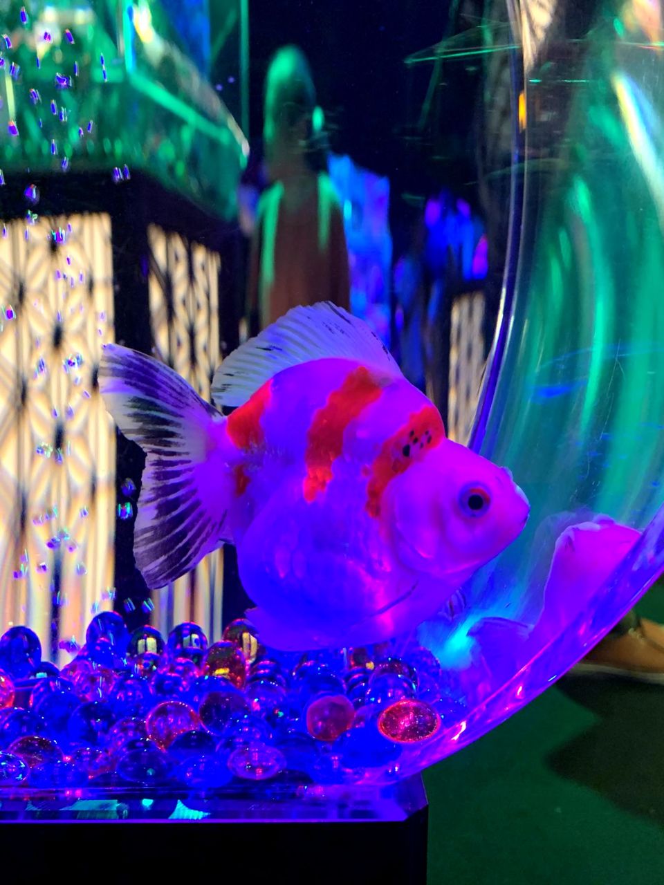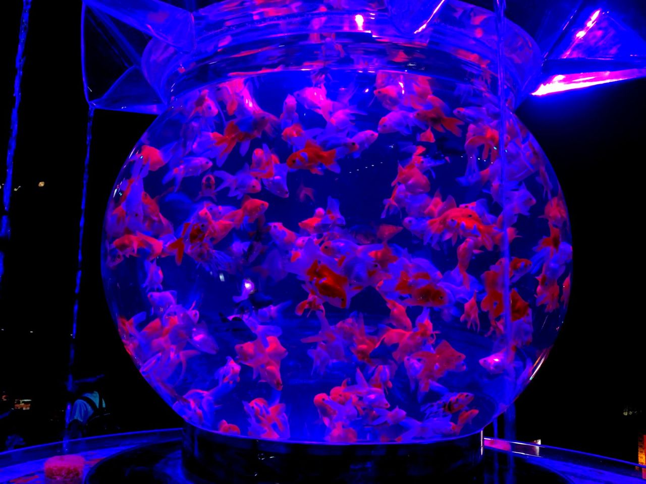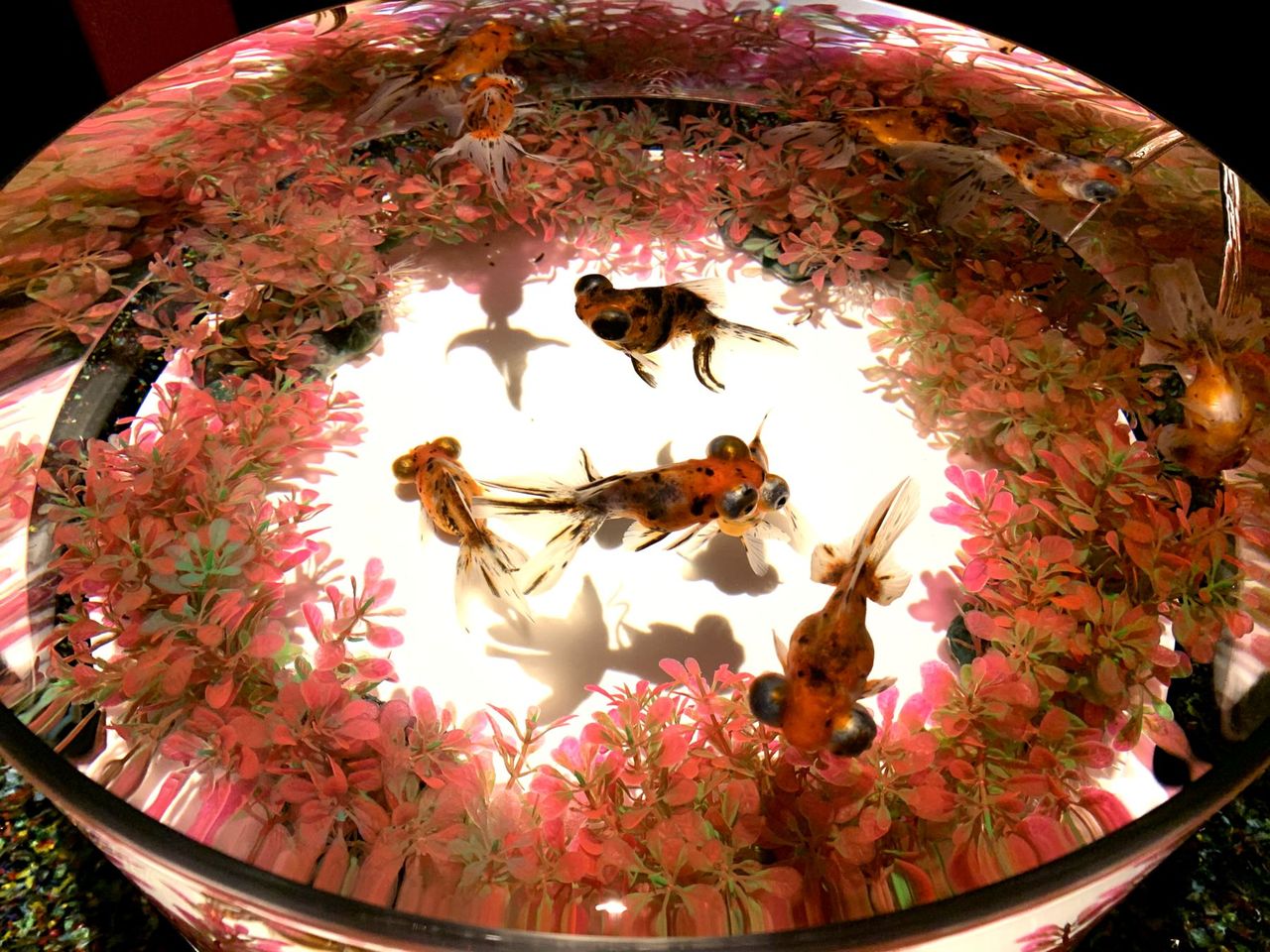 数秒毎に照明の色が変わっていくのだが、金魚には赤や青の照明は黒く見えてしまってNG。