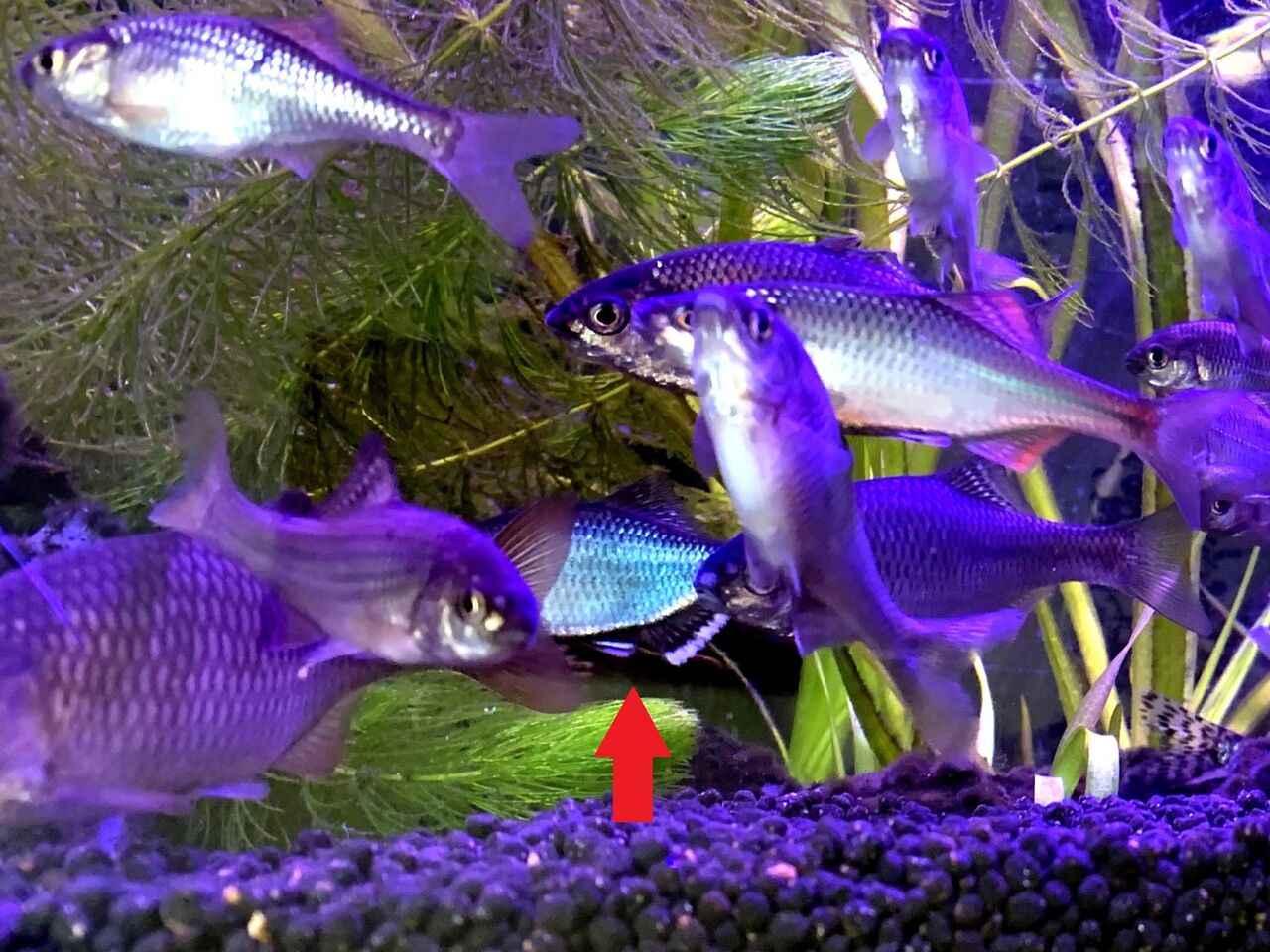 水槽に朝陽が射し込んだタイミングで、タナゴ達の奥でトレードマークである白い尻鰭と青く光る魚体を確認。