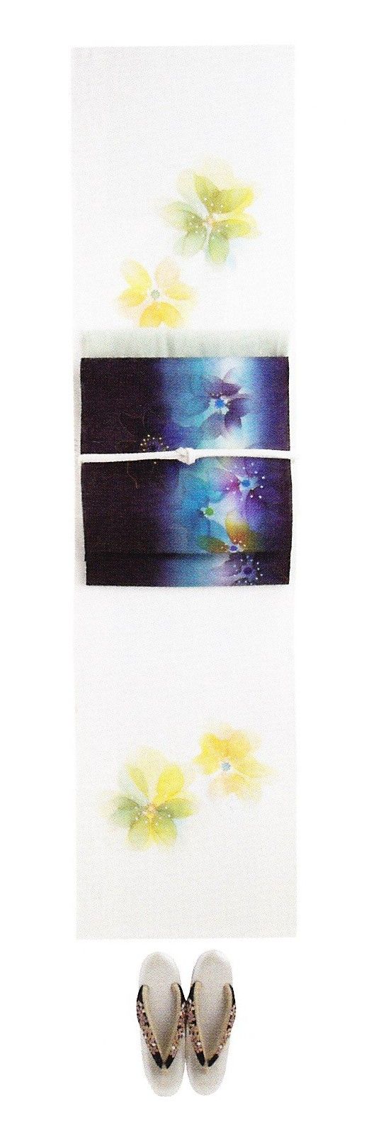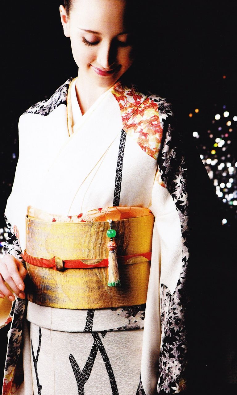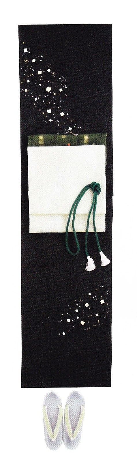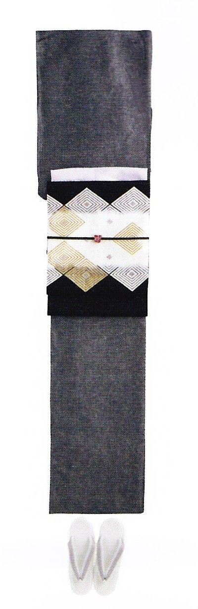 白と黒の着物地に映える金色の帯、