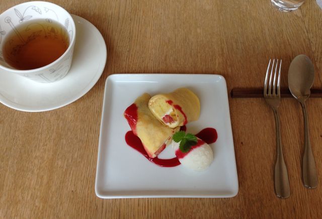 アイスとクレープのデザートとハーブティー
