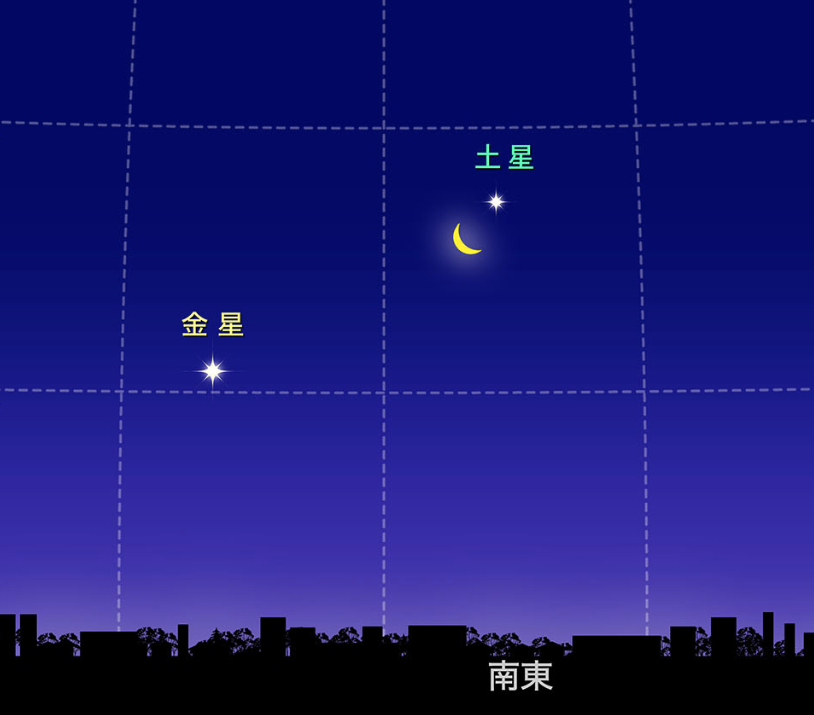 細い月と土星、金星の共演が見られます。