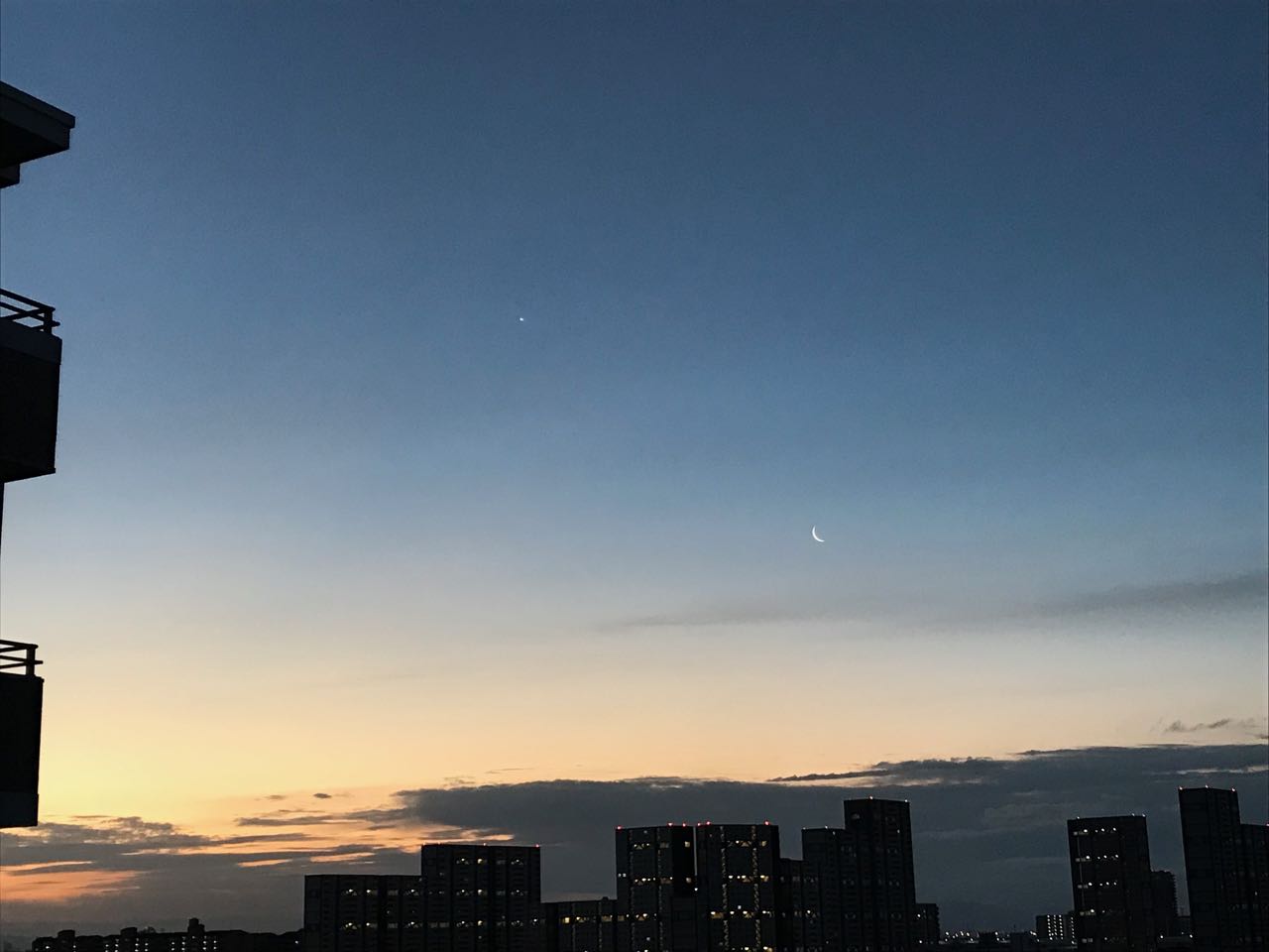 新月へと向かう細い月と明けの明星が。