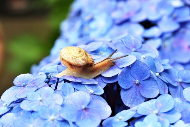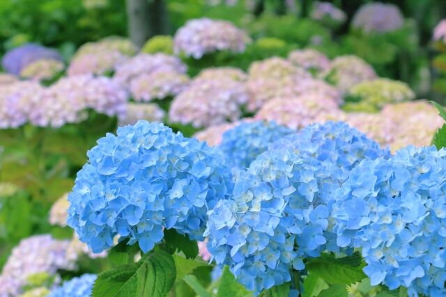 地上では色とりどりの紫陽花が雨のシャワーを浴びて