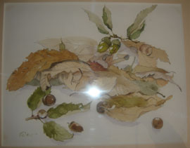 我が家の階段の踊り場には、数年前配偶者が、僕の誕生祝に知り合いの絵描きさんに頼んで書いてもらったどんぐりの水彩画が飾られている。