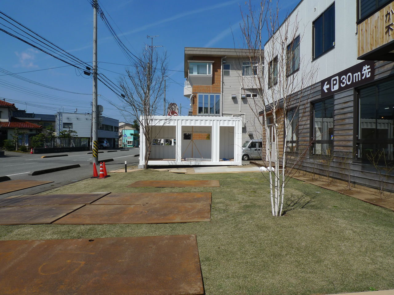 不動産会社さんが、社屋前の駐車場を芝生広場にして、ベンチ、デッキ、コンテナ店舗を設けられました。