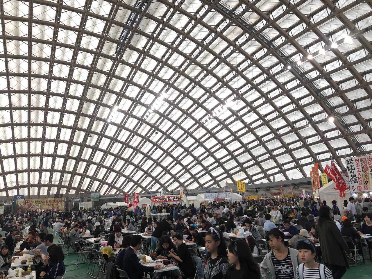 イオンスーパーセンター大館店に車を停め、そこからシャトルバスで11時頃会場に到着しましたが、会場の内外はすでに大勢のお客さんでにぎわっていました。明日は台風25号の接近が予想されるため、今日行っておきたいという人が自分の周りで多かったですが、例年の初日よりも賑わっていると感じるのは、そのせいもあるのでしょうか。