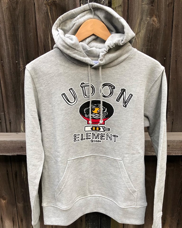 カレッジデザインロゴと言えばやっぱりスウェットパーカーでしょ!というわけで、かせきさいだぁ画伯デザインUDON ELEMENTカレッジパーカー、今年はカラーver.です!これを着て秋冬もしっかりうどん好きをアピールしていきましょう!