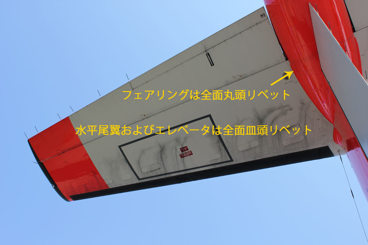 垂直尾翼と水平尾翼取り付け部のフェアリングは全面丸頭リベット。(フェアリングの上面も丸頭リベットです)