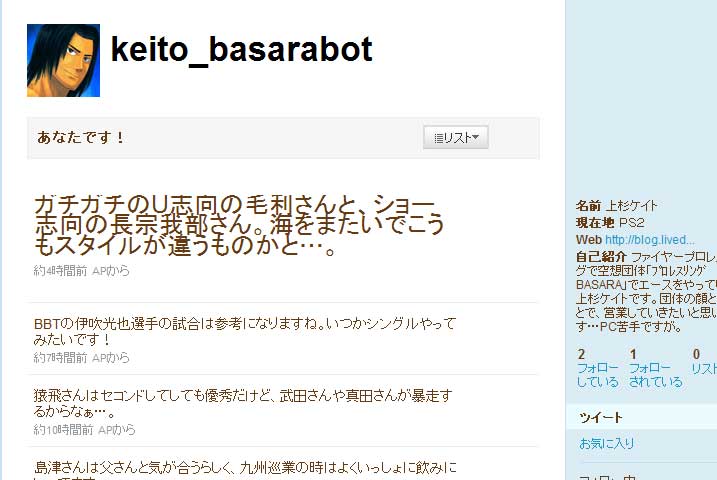 2010ǯ03·î24Æü ¥±¥¤¥È¤Ê¤¦ ¡¡ËÜʪ¤Î¥×¥í¥ì¥¹¥é¡¼¤â¤ä¤Ã¤Æ¤¤¤ë twitter¤Ç¤¹¤¬¡¢²¾ÁÛ¿Íʪ¤¬È¯¸À¤¹¤ë bot¤È¤¤¤¦¤â¤Î¤¬Î®¹Ô¤Ã¤Æ¤¤¤Þ¤¹¡£ ¤½¤³¤Ç¾å¿ù¥±¥¤¥È¤Îbot¤òºî¤Ã¤Æ ¸«¤Þ¤·¤¿¡£¥Õ¥¡¥¤¥×¥í½é¤Î»î¤ß ¤«¤â¤·¤ì¤Þ¤»¤ó£÷¡¡botƱ»Î¤¬ ȯ¸À¤·¤¢¤Ã¤Æ¡¢¹³Áè¤È¤«»Ï¤á¤¿¤é¡¢ ̤Íè¤ò´¶¤¸¤ì¤½¤¦¤Ç¤¹¤¬¡£ ¥æ¡¼¥¶¡¼Ì¾¤Ï¡¡keito_basarabot¡¡¤Ç¤¹¡£ °ìÄê»þ´Ö¤ª¤¤Ë²¿¤é¤«¤Îȯ¸À¤ò¤·¤Þ¤¹¡£