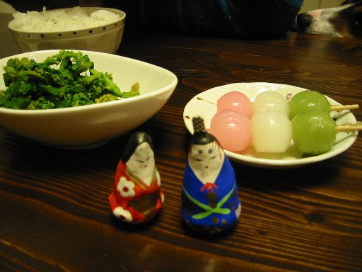 今日は雛祭前日。まーちゃんの赤ちゃんが女の子だと判ったので、小さい雛人形とお団子と菜の花のおひたしで1日早い雛祭。