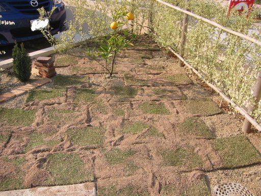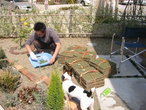 休日の天気のいい日をねらってポツポツと庭作りをするまーちゃん。この日は芝生をはりました。