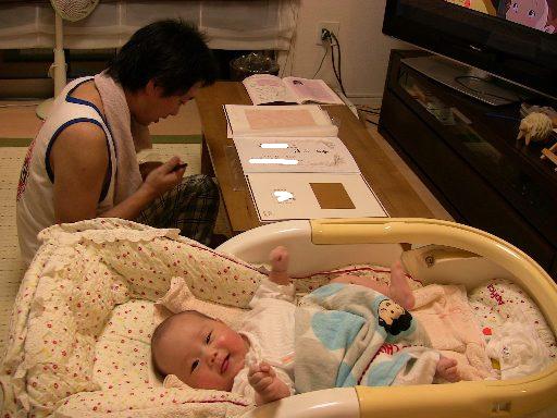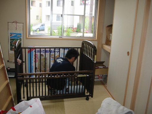 最終日の昨日は、赤ちゃんの部屋つくりをしました。荷物を整理して、ベビーベッドを組み立てるまーちゃん。