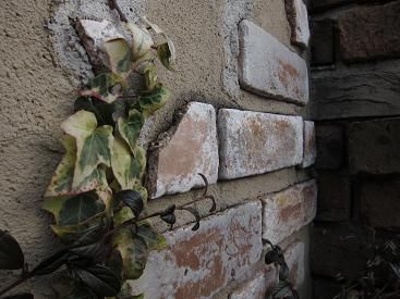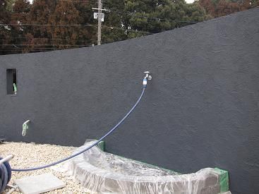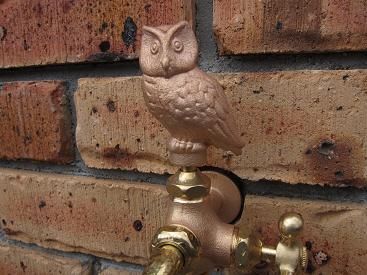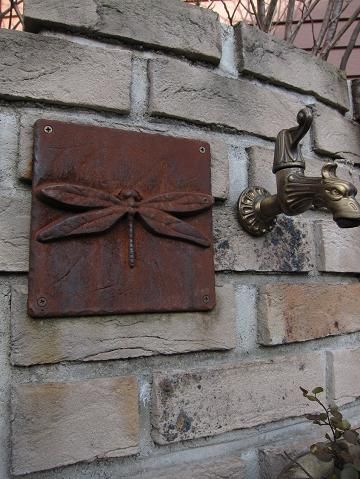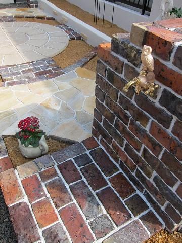 したレンガ造りの立水壁にも、真鍮製の2口蛇口
