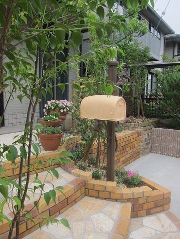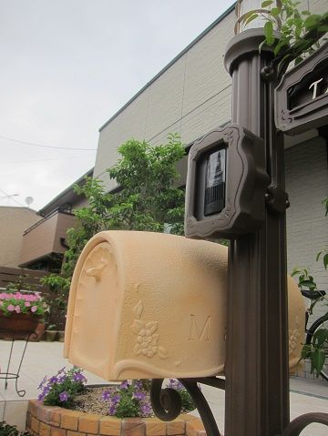 レンガ積みの花壇内に設置しました機能門柱は、