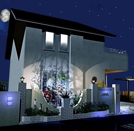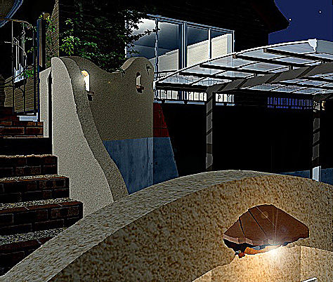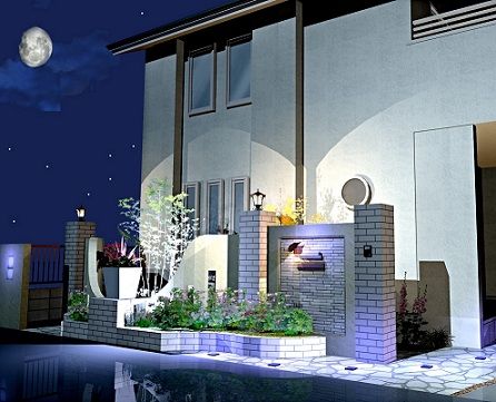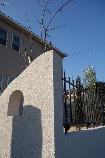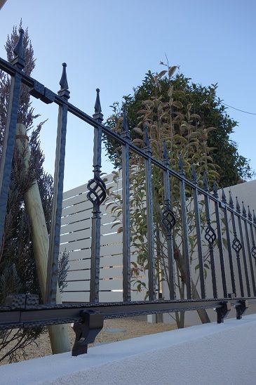 曲線壁から連なるアルミ鋳物フェンスに囲まれ