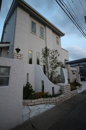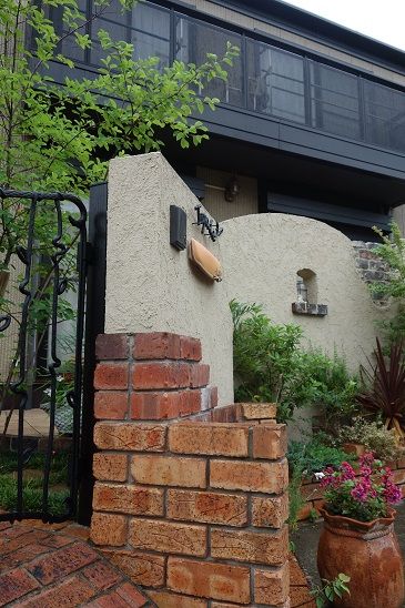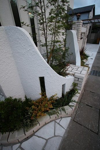 ガーデンアイテムも、優しい曲線形状の門壁