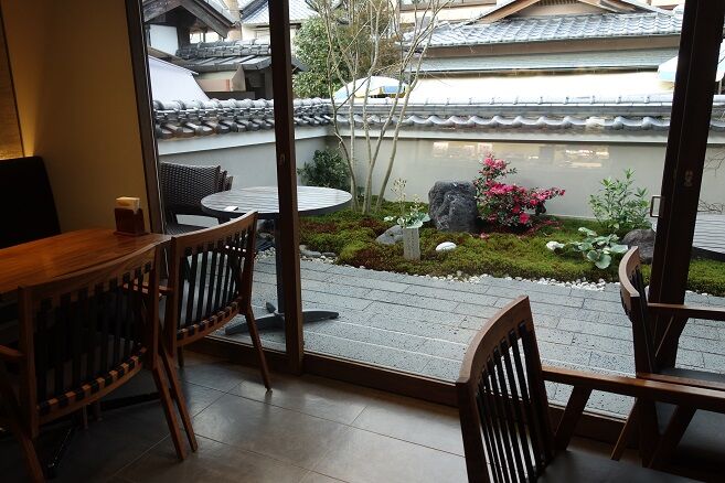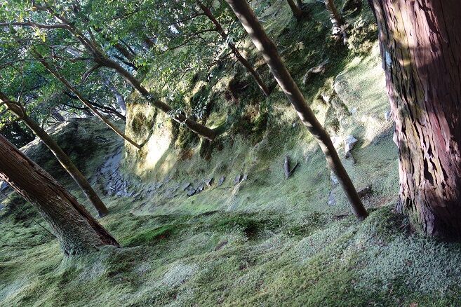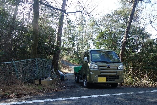 道路面に近いヶ所の、乱形石材敷きスペ