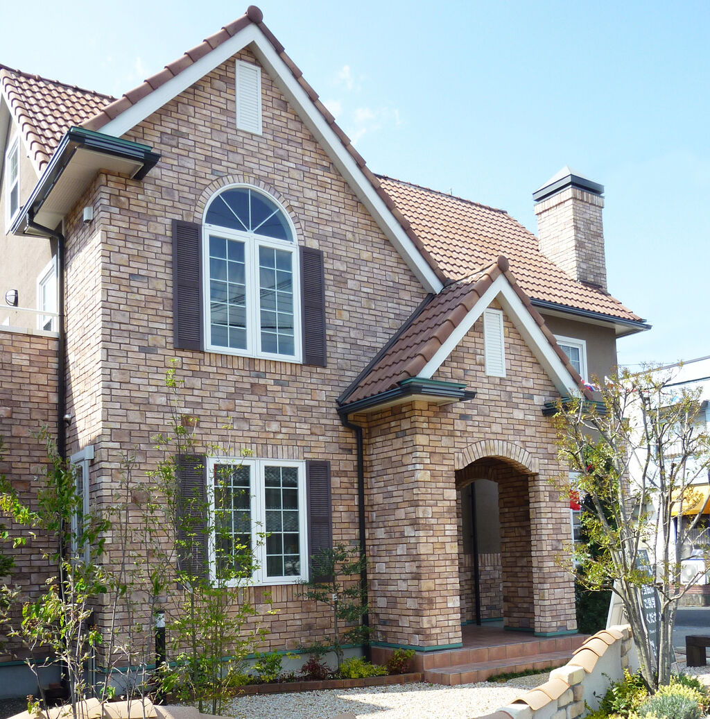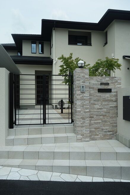 レンガ造りの階段アプローチを挟むように、同じ樹