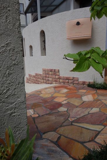 レンガや石材など、全てピンク基調の素材を