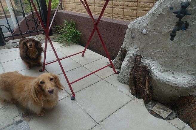 で、愛犬ダックスフントたちを遊ばせながら、