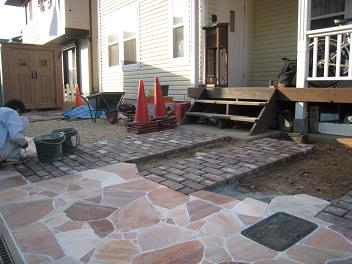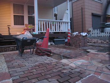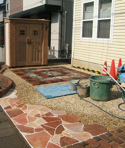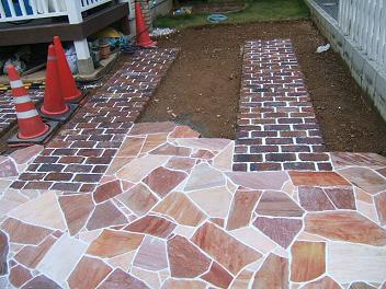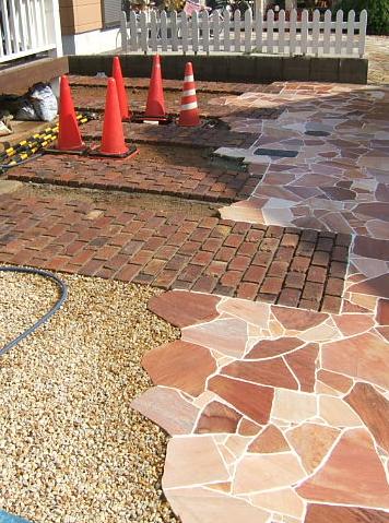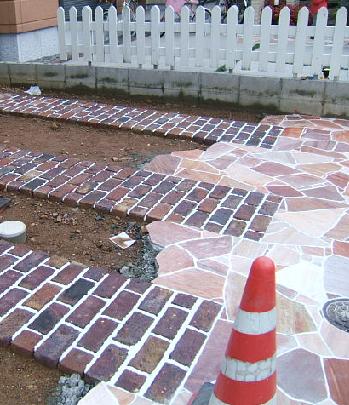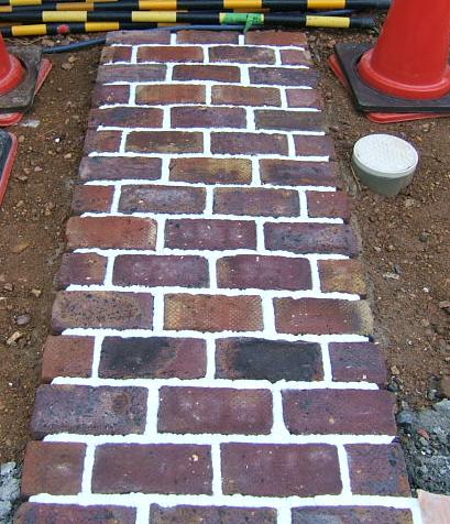 白い目地が入る前のレンガ敷きアプローチ