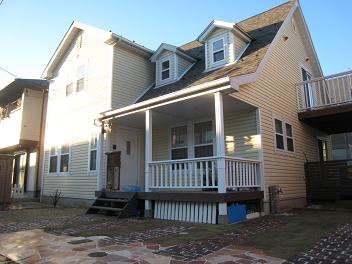 玄関ポーチ代わりのウッドデッキに向かって