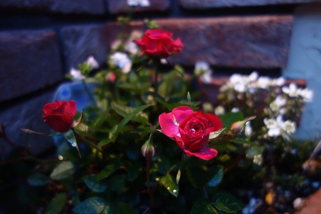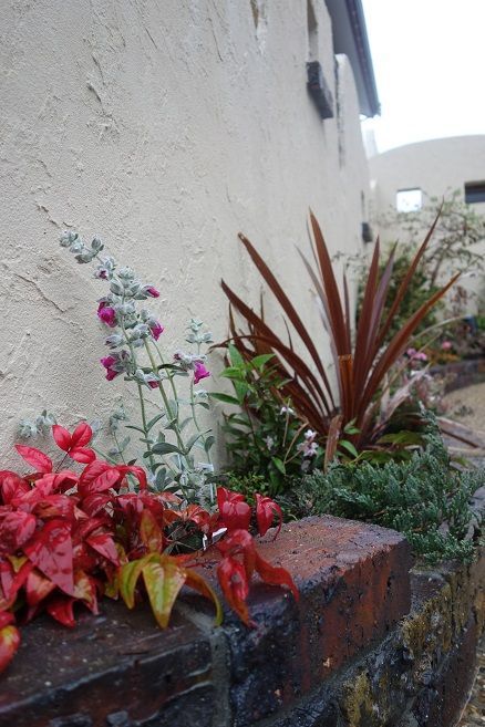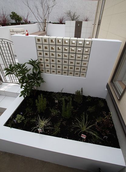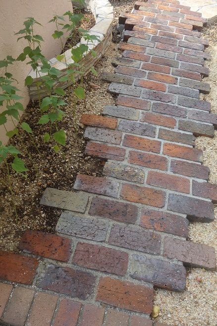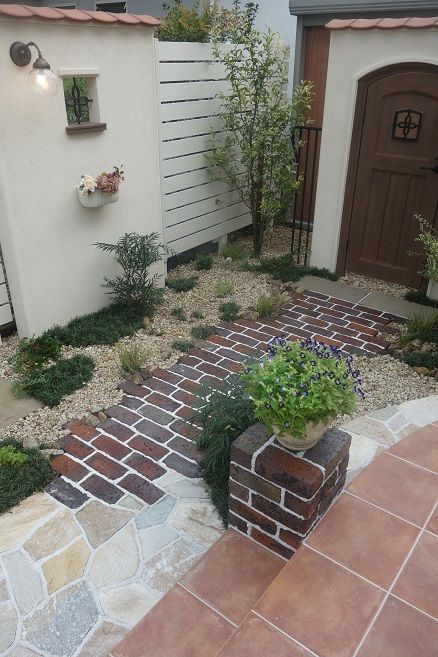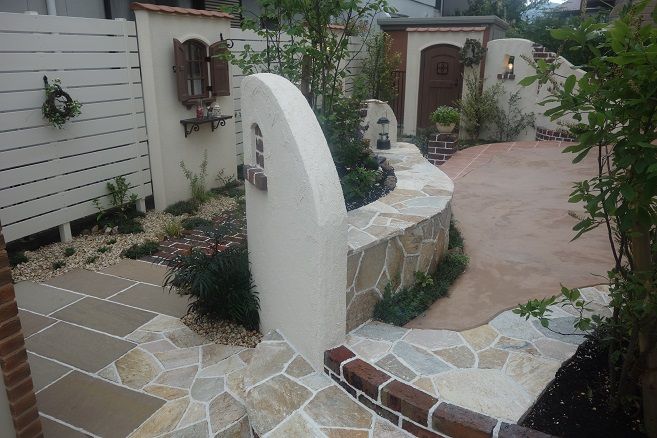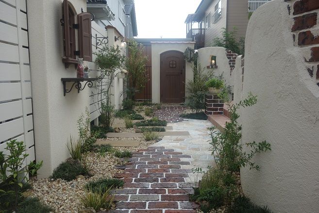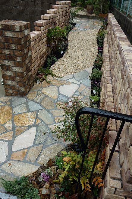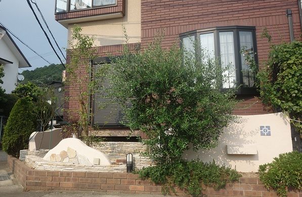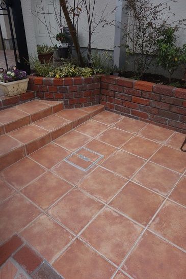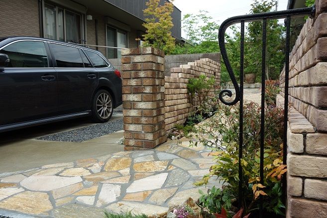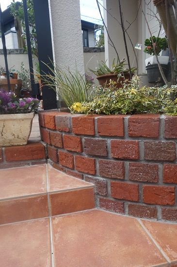 レンガ積み仕上げの花壇も、1枚1枚を