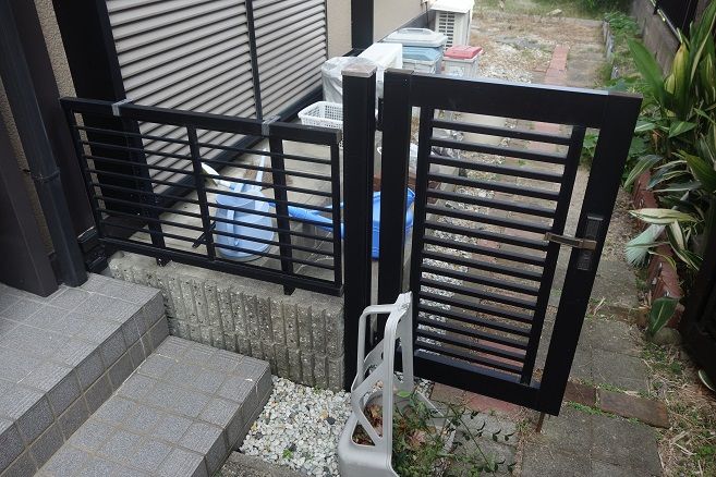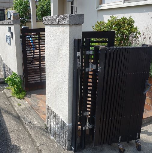 アルミ鋳物製の門扉を設置しながら、クロ