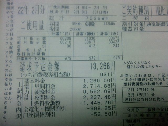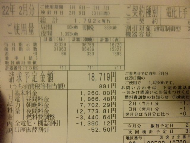 先月は雪が降るなどエアコン暖房も長めに使用してたからですかね。