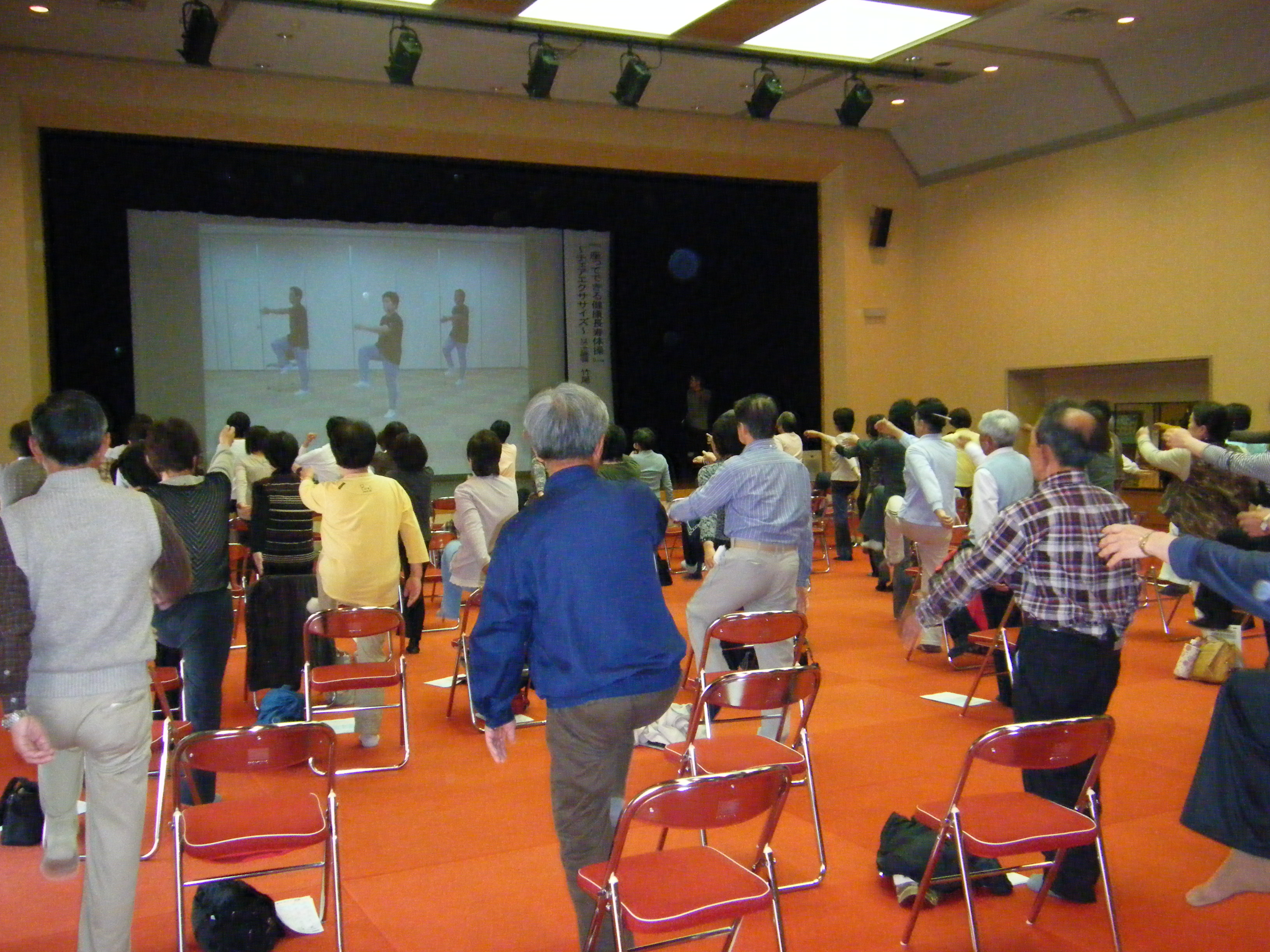 写真は、いきいき支援課 課長さまの最初のご挨拶と「ひがしおうみ元気キラリ体操」を舞台の映像を見ながら、皆さんが取り組んでいらっしゃる様子です。