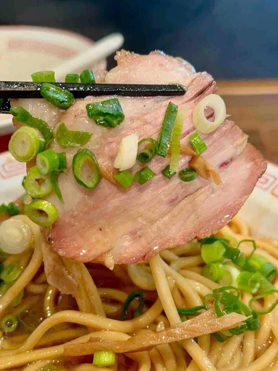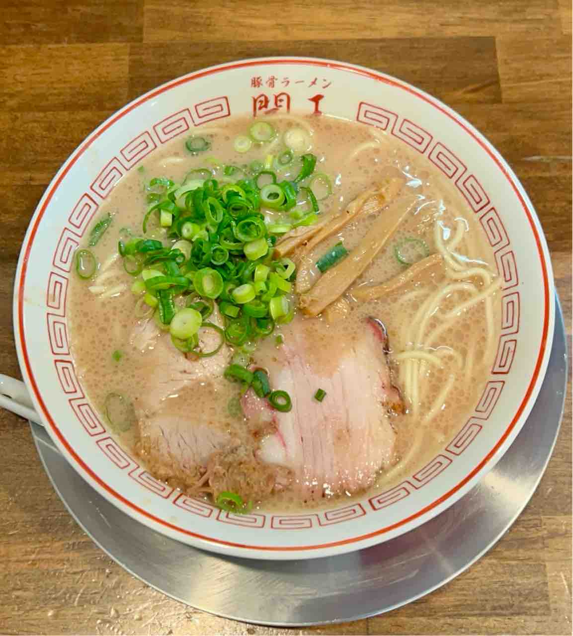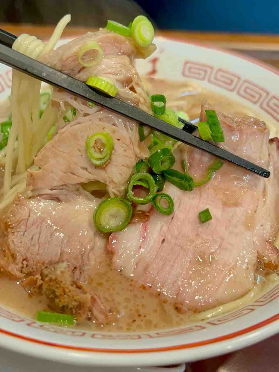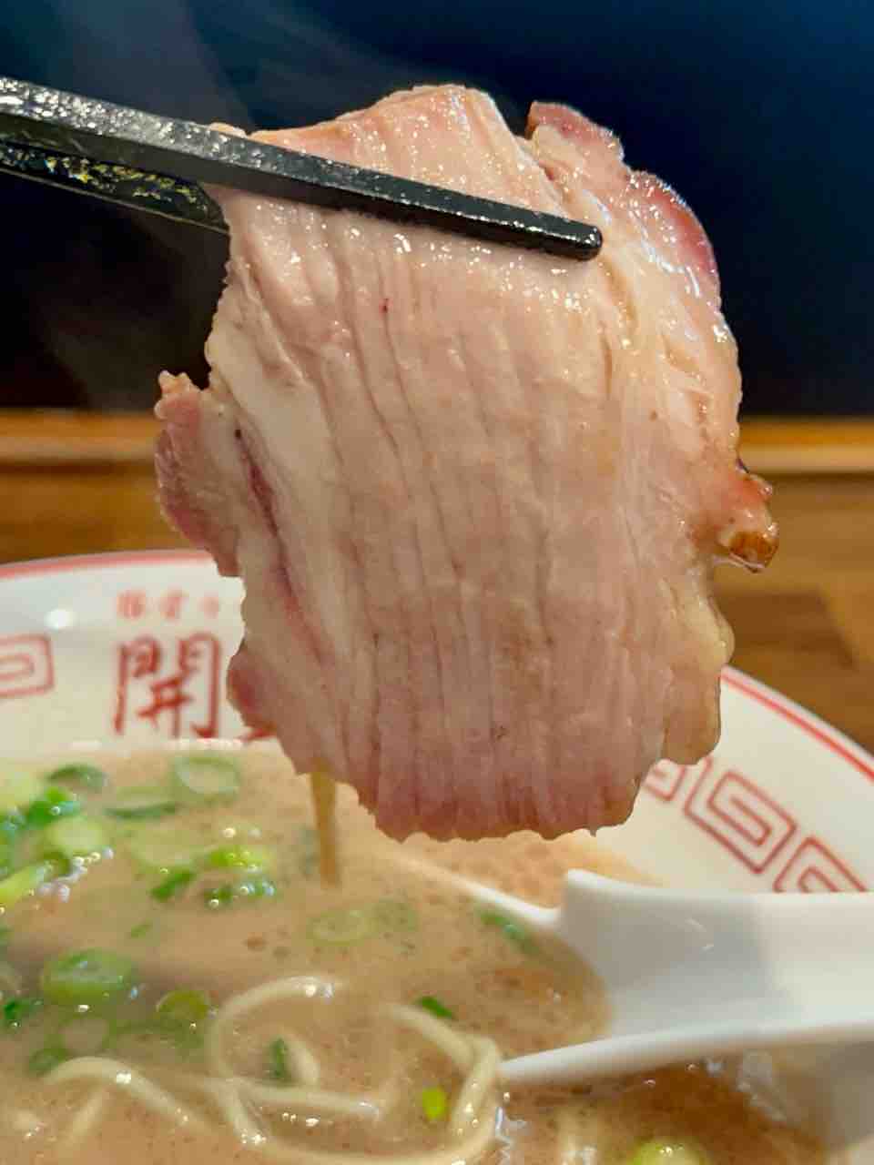 麺はイメージ的な豚骨ラーメンと比べるとやや太め、トッピングはチャーシューが2種類