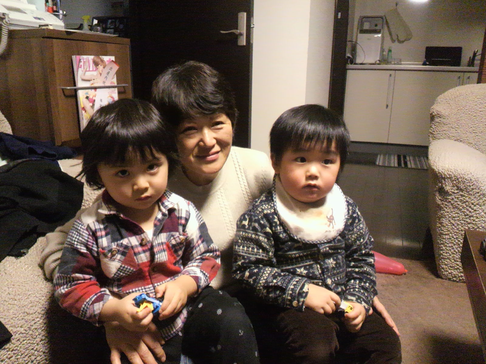 バァバのひざに座ってテレビ見てる2人。